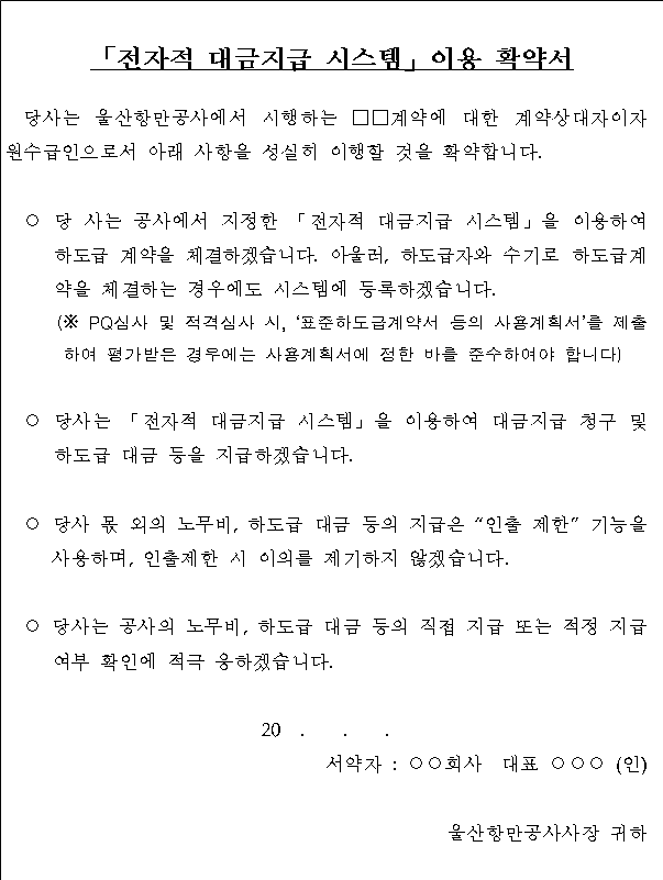 나. 입찰에 참여하는 자는 입찰서 제출 시 [붙임2] ‘전자적 대금지급 시스템 이용 확약서’를 제출하여야 합니다. 다만, 나라장터를 이용하여 입찰서를 제출하는 경우에는 전자입찰서에 ‘전자적 대금지급 시스템 이용 확약서’ 내용을 포함한 것으로 보고 전자입찰서 제출로 확약서 제출을 갈음합니다.