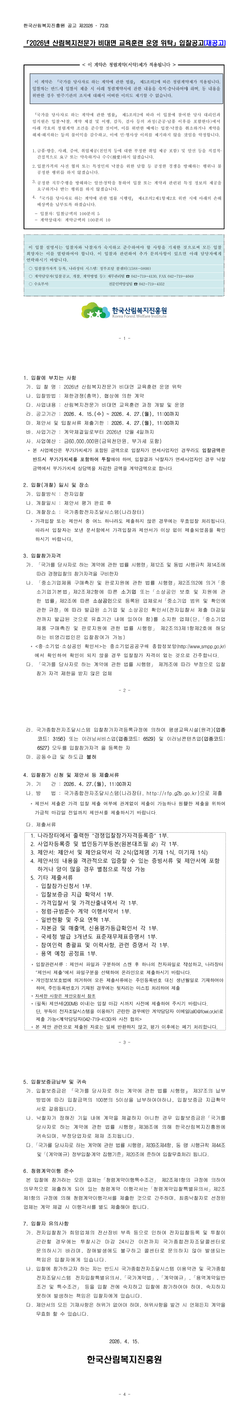 2026년 산림복지전문가 비대면 교육훈련 운영 위탁(재공고) |