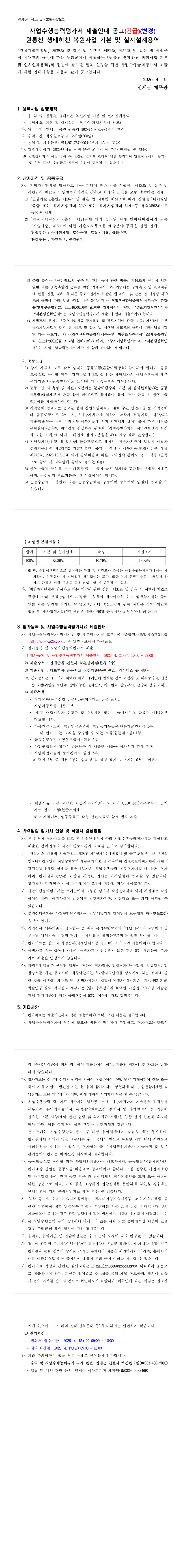 사업수행능력평가서 제출안내 공고[원통천 생태하천 복원사업 기본 및 실시설계용역] |