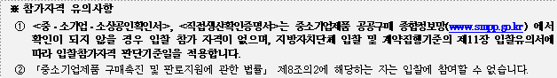 ※ 본 입찰에 미 자격자가 고의로 입찰에 참가할 때에는 「지방계약법 시행령」 제92조에 의거 관련법규에 따라 부정당업자로 제재할 수 있습니다. 입찰대리인은 반드시 입찰참가업체의 임ㆍ직원이어야 하며, 같은법 시행규칙 제42조 제5호에 따른 변경등록을 하지 않은 입찰자의 입찰은 무효입니다.