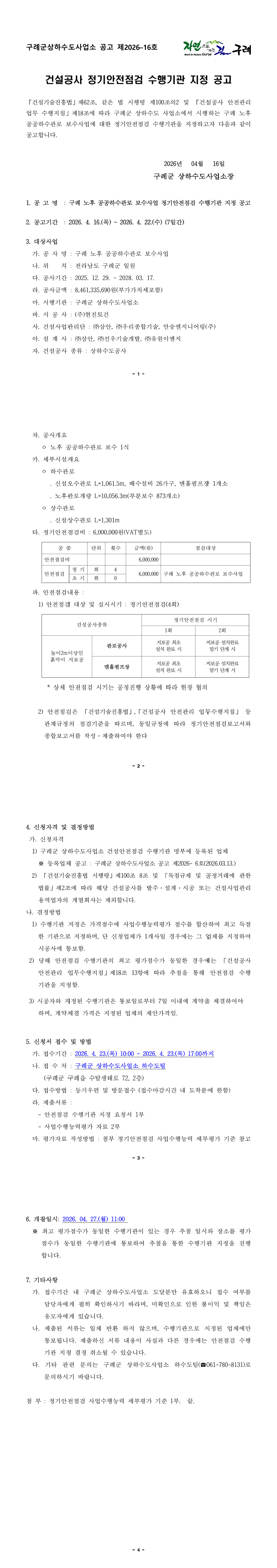 구례 노후 공공하수관로 보수사업 안전점검 수행기관 지정 공고 |