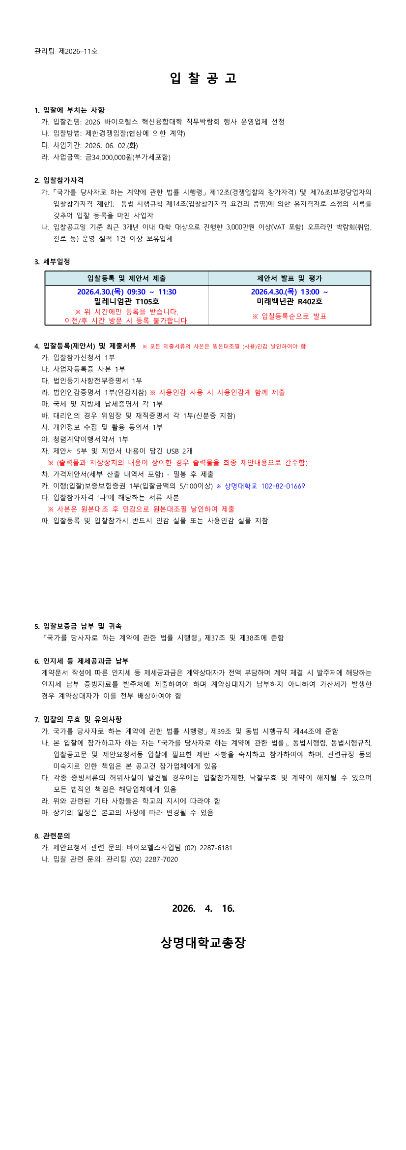 2026 바이오헬스 혁신융합대학 직무박람회 행사 운영업체 선정 |