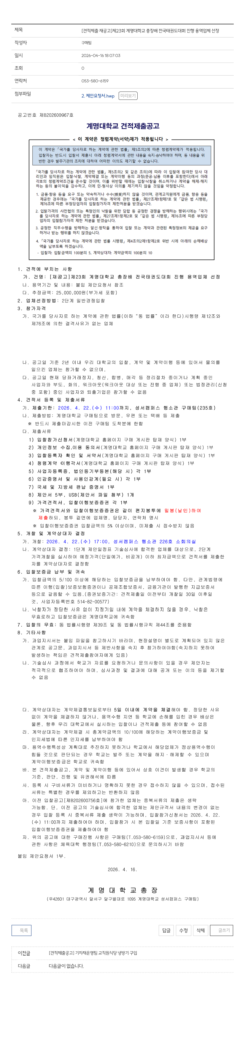 제23회 계명대학교 총장배 전국태권도대회 진행 용역업체 선정 |