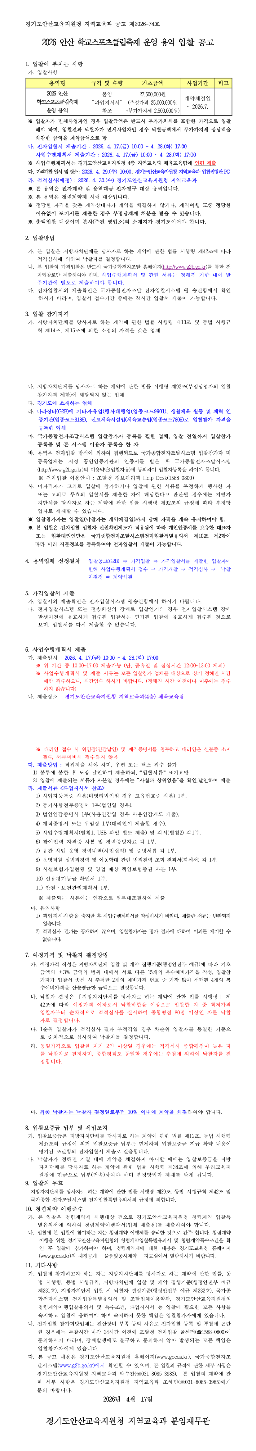2026 안산 학교스포츠클럽축제 운영 용역 입찰 공고 |