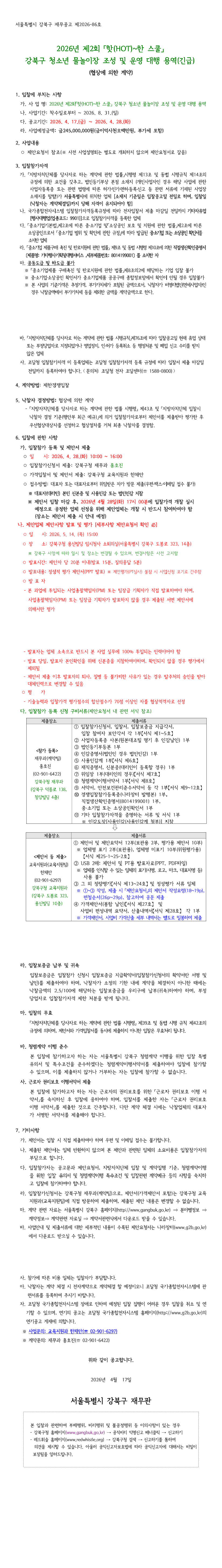 2026년 제2회 핫~한 스쿨 강북구 청소년 물놀이장 조성 및 운영 대행용역 |