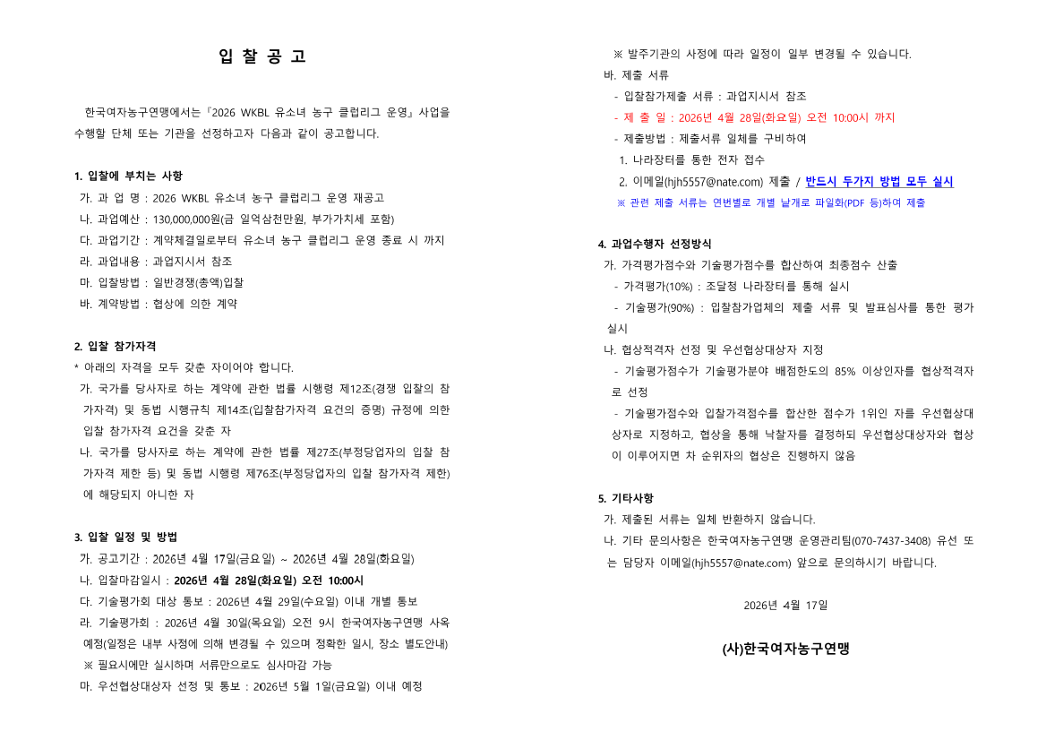 [긴급] 2026 WKBL 유소녀 농구 클럽리그 운영 재공고 |