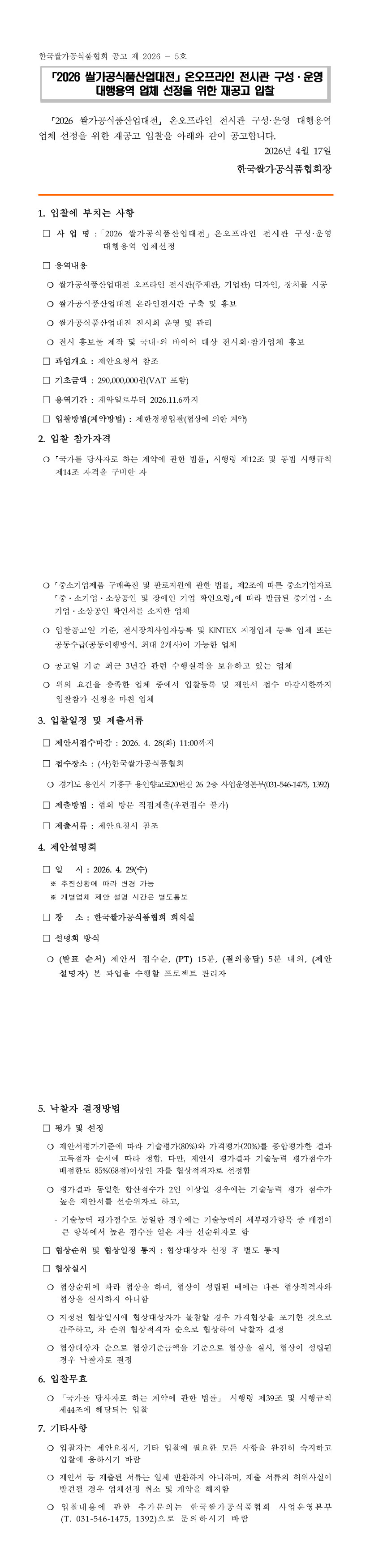 「2026 쌀가공식품산업대전 온오프라인 전시관 구성·운영」 대행용역 업체 선정을 위한 재공고 입찰 |