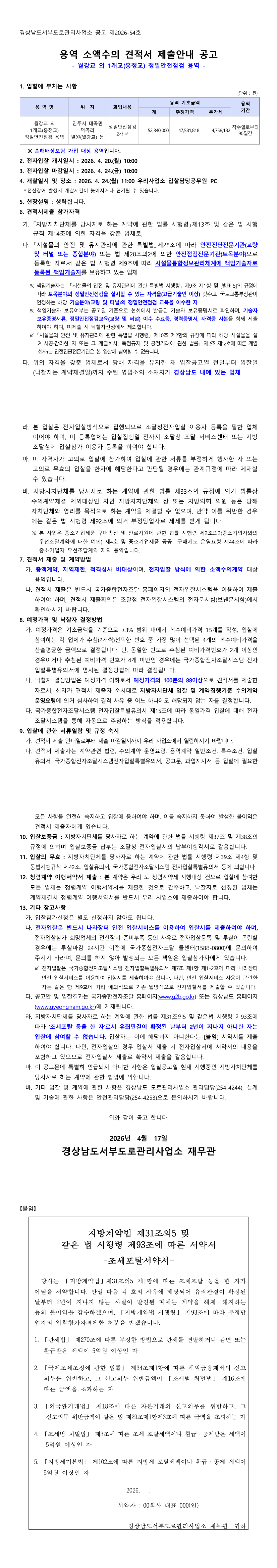용역 소액수의 견적 제출안내 공고[월강교 외 1개교(홍정교) 정밀안전점검용역] |