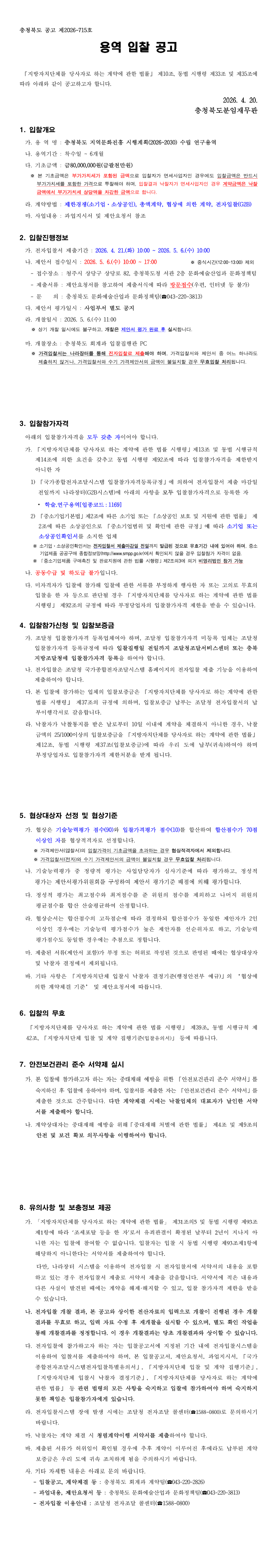 충청북도 지역문화진흥 시행계획(2026~2030) 수립 연구용역 |