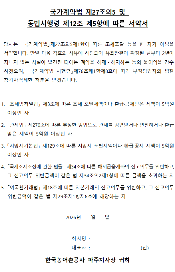 3. 최종 낙찰자로 선정된 업체는 계약 체결시 서명 또는 날인하여 청렴계약 이행각서를 우리공사에 별도 제출하여야 합니다.