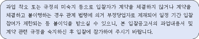 ※ 입찰자가 면세사업자(영세율을 적용받는 사업자)인 경우 입찰금액은 반드시 부가가치세(10%)를 포함하여 투찰하여야 하며, 입찰 결과 낙찰자가 면세사업자인 경우 낙찰금액에서 부가가치세 상당액을 차감한 금액을 계약금액으로 합니다.