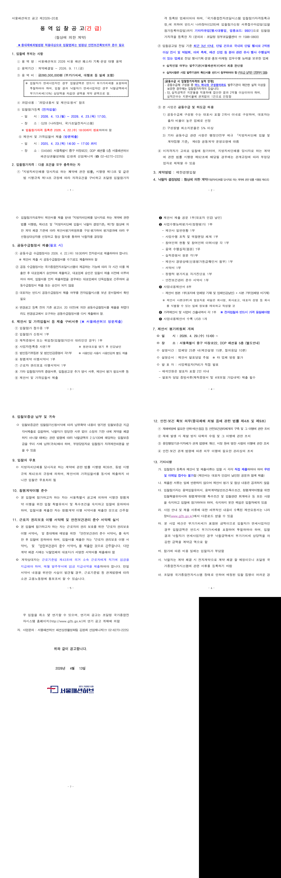 서울패션허브 2026 서울패션페스타 기획운영 대행 용역 |
