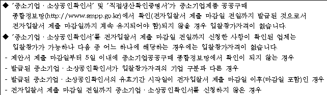 ◆ 「중소기업제품 구매촉진 및 판로지원에 관한 법률」제33조 제1항에 의거 소기업 또는 소상공인으로 간주되는 특별법인은 입찰참가 가능합니다.