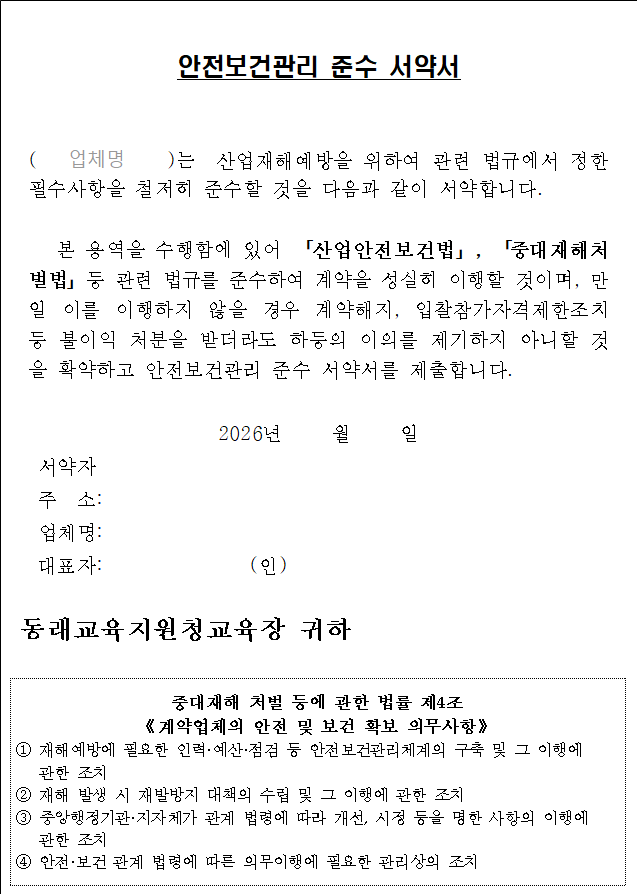 마. 본 입찰에 참가하고자 하는 자는 중대재해 예방을 위한 안전 및 보건 확보 의무 사항을 숙지하신 후 입찰에 응하여야 하며, 계약 체결 시에 【붙임 3】「안전보건관리 준수 서약서」를 제출하여야 합니다.