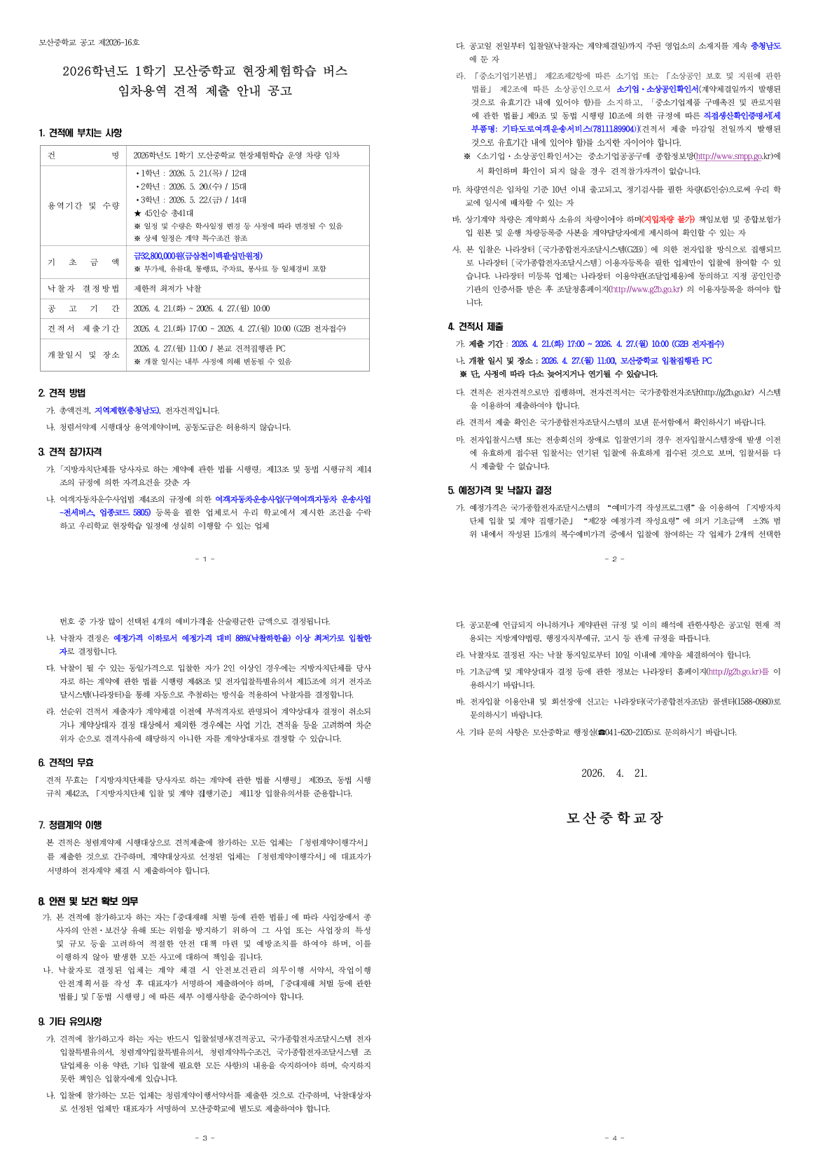 2026학년도 1학기 모산중학교 현장체험학습 버스 임차용역 견적 제출 안내 공고 |