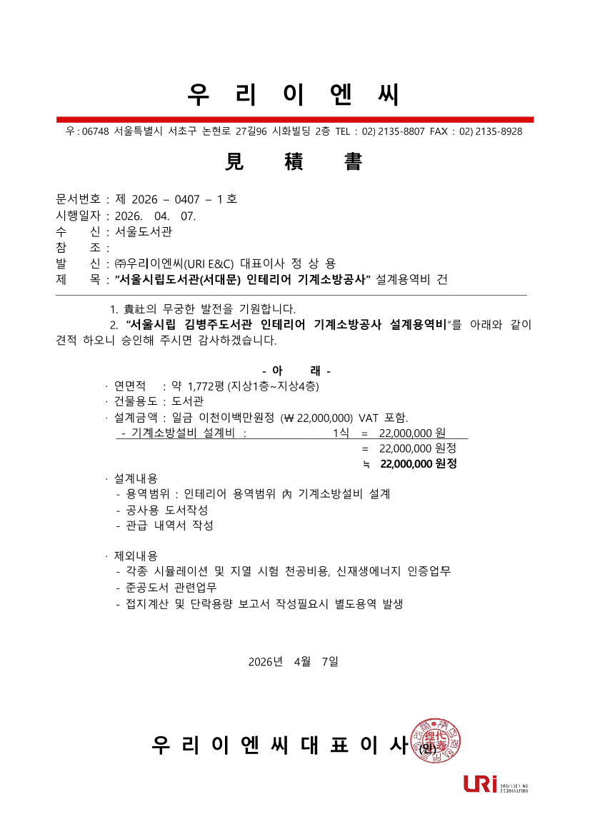 서울시립도서관(서대문구 소재)개관 추진 관련 기계소방 설계 용역 |