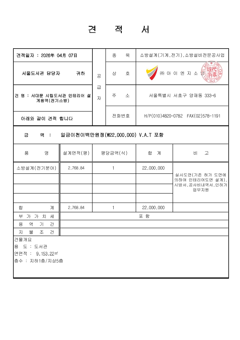 서울시립도서관(서대문구 소재)개관 추진 관련 전기소방 설계 용역 |