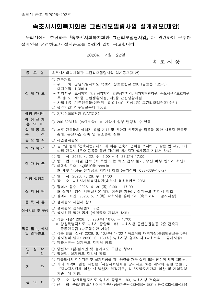 속초시사회복지회관 그린리모델링사업 설계공모 |