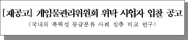 게임물관리위원회에서는 ‘국내외 폭력성 등급분류 사례 심층 비교 연구’ 위탁 사업자를 다음과 같이 모집합니다.