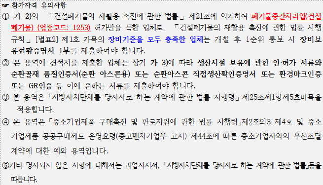 2) ⌜건설폐기물의 재활용 촉진에 관한 법률⌟ 제21조에 의거하여 국가종합전자조달시스템에 폐기물수집·운반업(건설폐기물) (업종코드: 6728) , 폐기물중간처리업(건설폐기물) (업종코드: 1253)의 업종을 모두 등록하고 관련 법에 따른 허가를 득한 업체 또는 폐기물중간처리업(건설폐기물) (업종코드: 1253) 허가만을 득한 업체로, ⌜건설폐기물의 재활용 촉진에 관한 법률 시행규칙⌟ [별표2] 제1호 가목의 장비기준을 모두 충족한 업체
