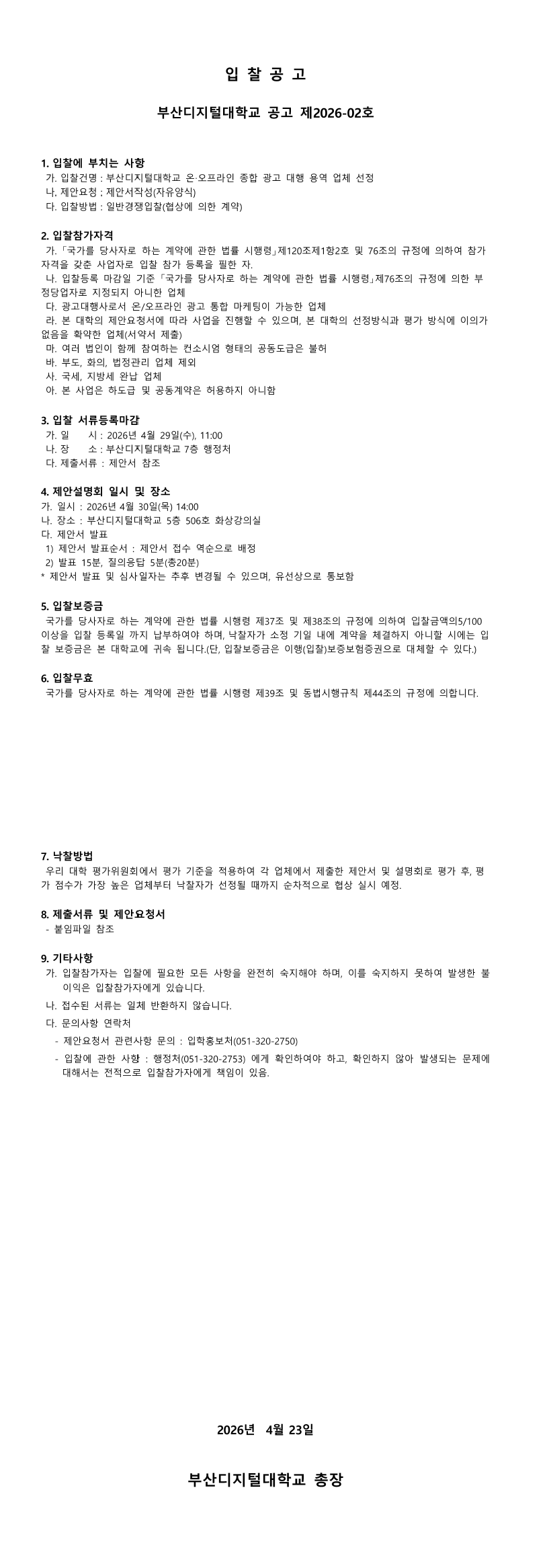 2026년 부산디지털대학교 온·오프라인 종합광고 대행 용역 입찰 |