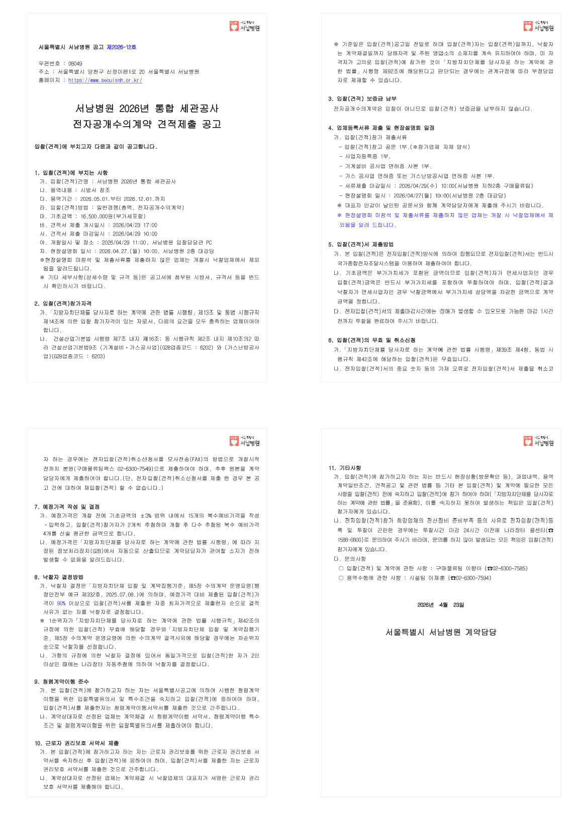 서남병원 2026년 통합 세관공사 전자공개 수의계약 견적제출 공고 |