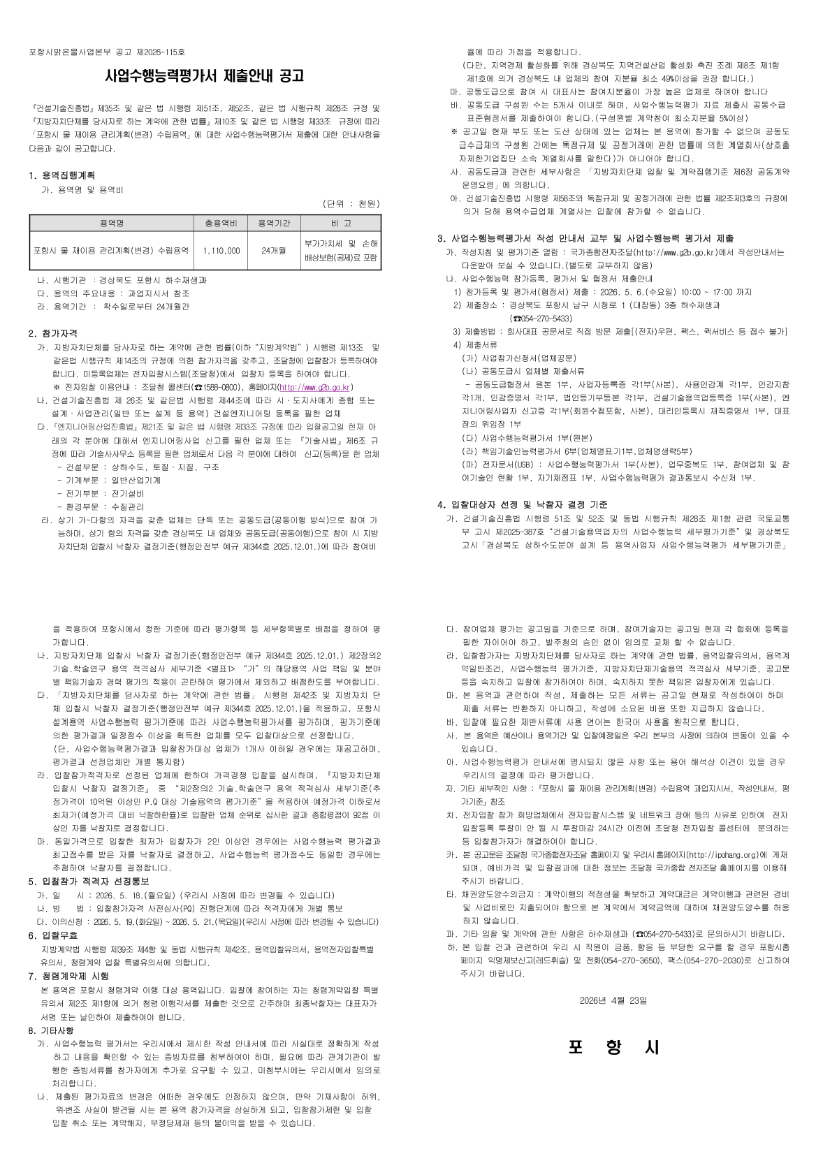 포항시 물 재이용 관리계획(변경) 수립 용역 집행계획 및 사업수행능력평가서 제출 안내 공고 |