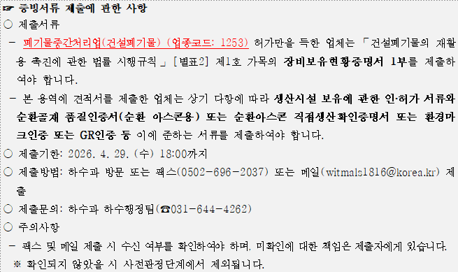 다. 「건설폐기물의 처리 등에 관한 업무처리지침(기후환경에너지부예규 제22호)」에 따라 아스콘용 순환골재 또는 순환아스콘 생산시설을 보유하고 그에 따른 생산·관리가 가능한 업체여야 합니다.