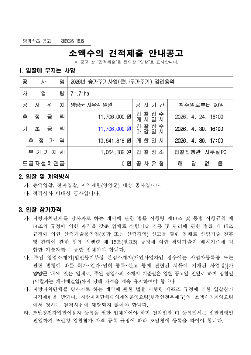 2026년 숲가꾸기사업 (큰나무가꾸기) 감리용역 |