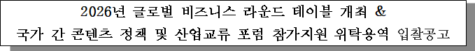 ㅇ 입찰건명 : 2026년 글로벌 비즈니스 라운드 테이블 개최 & 국가 간 콘텐츠 정책 및 산업교류 포럼 참가지원 위탁용역