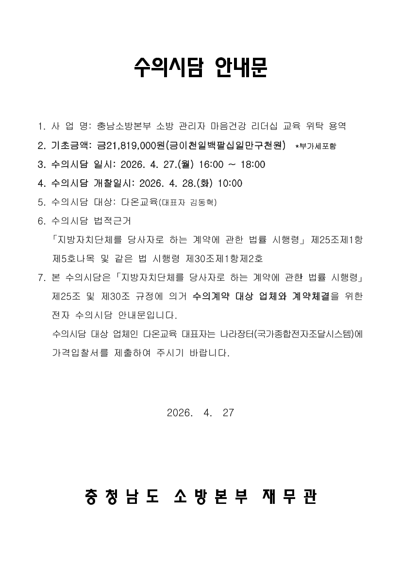 충남소방본부 소방 관리자 마음건강 리더십 교육 위탁 용역 |