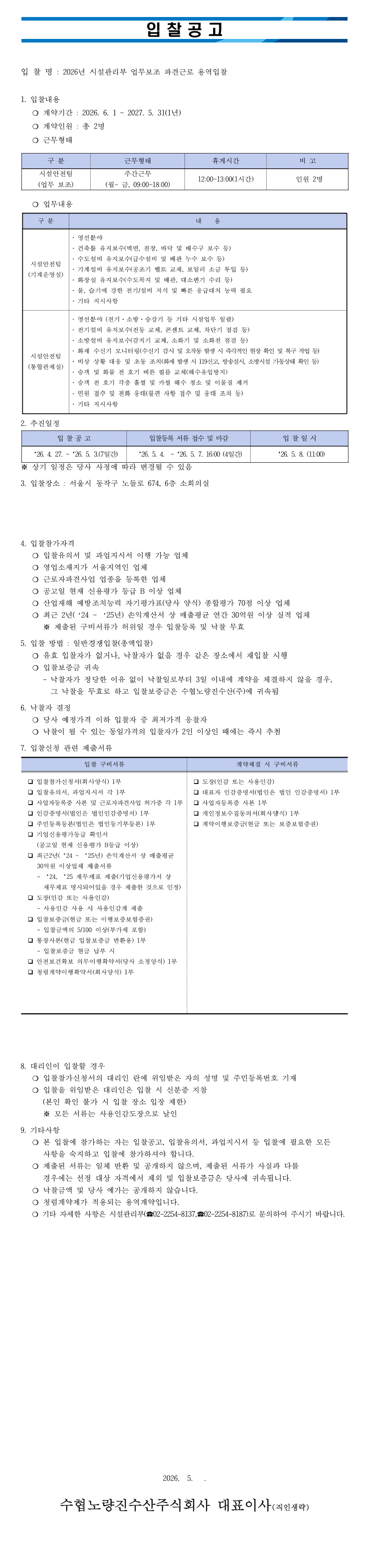 2026년 시설관리부 업무보조 파견근로 용역입찰 |