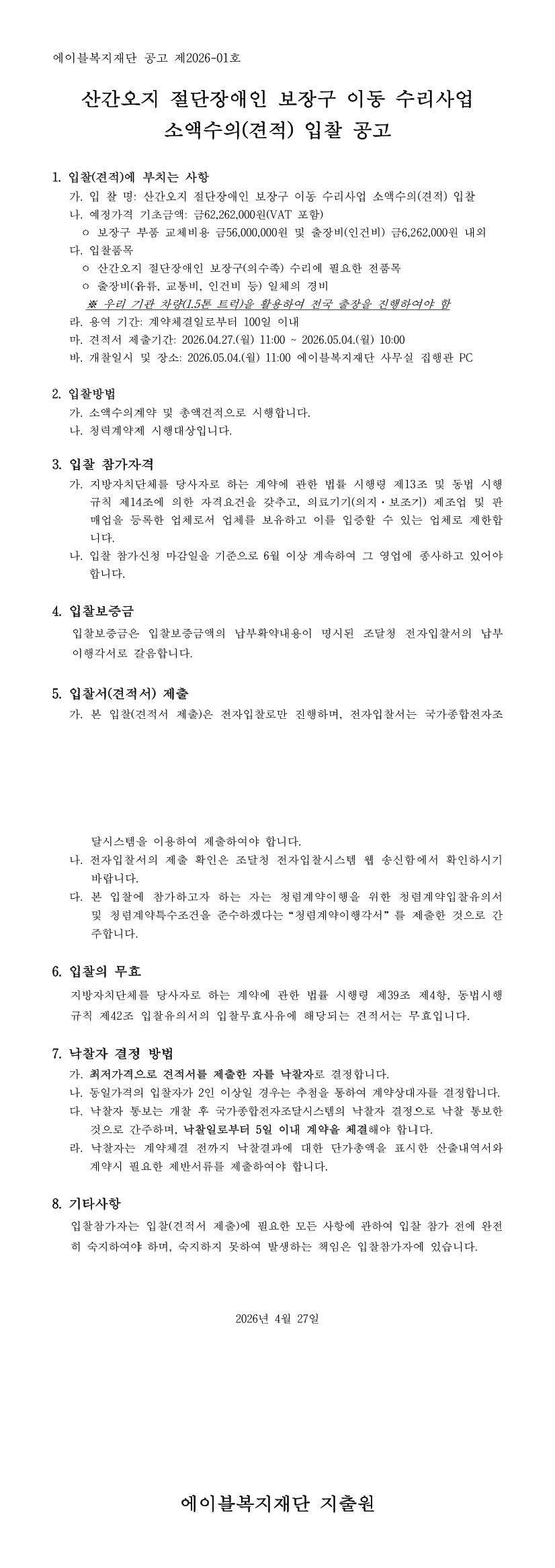 산간오지 절단장애인 보장구 이동 수리사업 소액수의(견적) 입찰 공고 |
