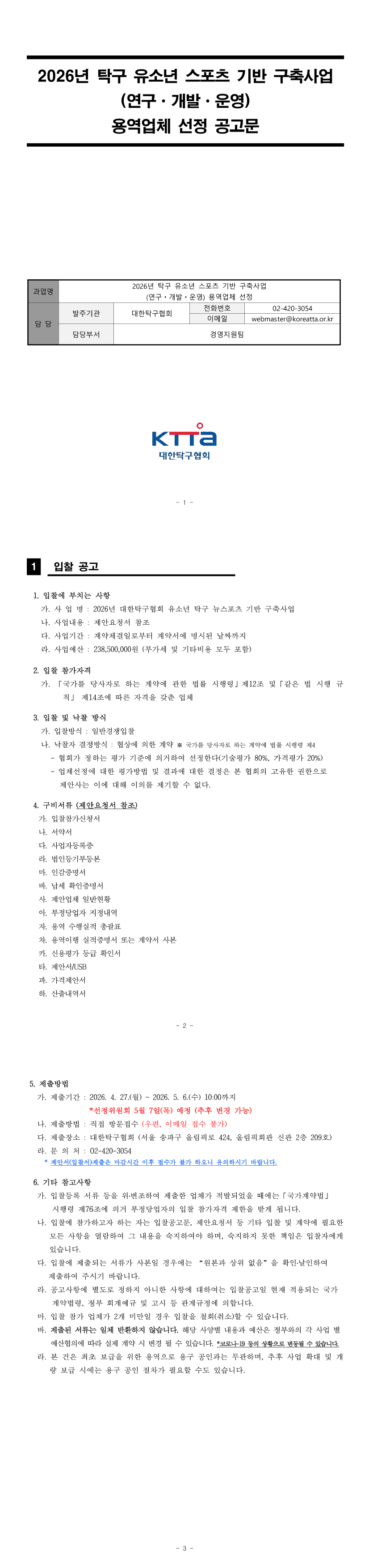 2026년 탁구 유소년 스포츠 기반 구축사업 (연구ㆍ개발ㆍ운영) 용역업체 선정 |