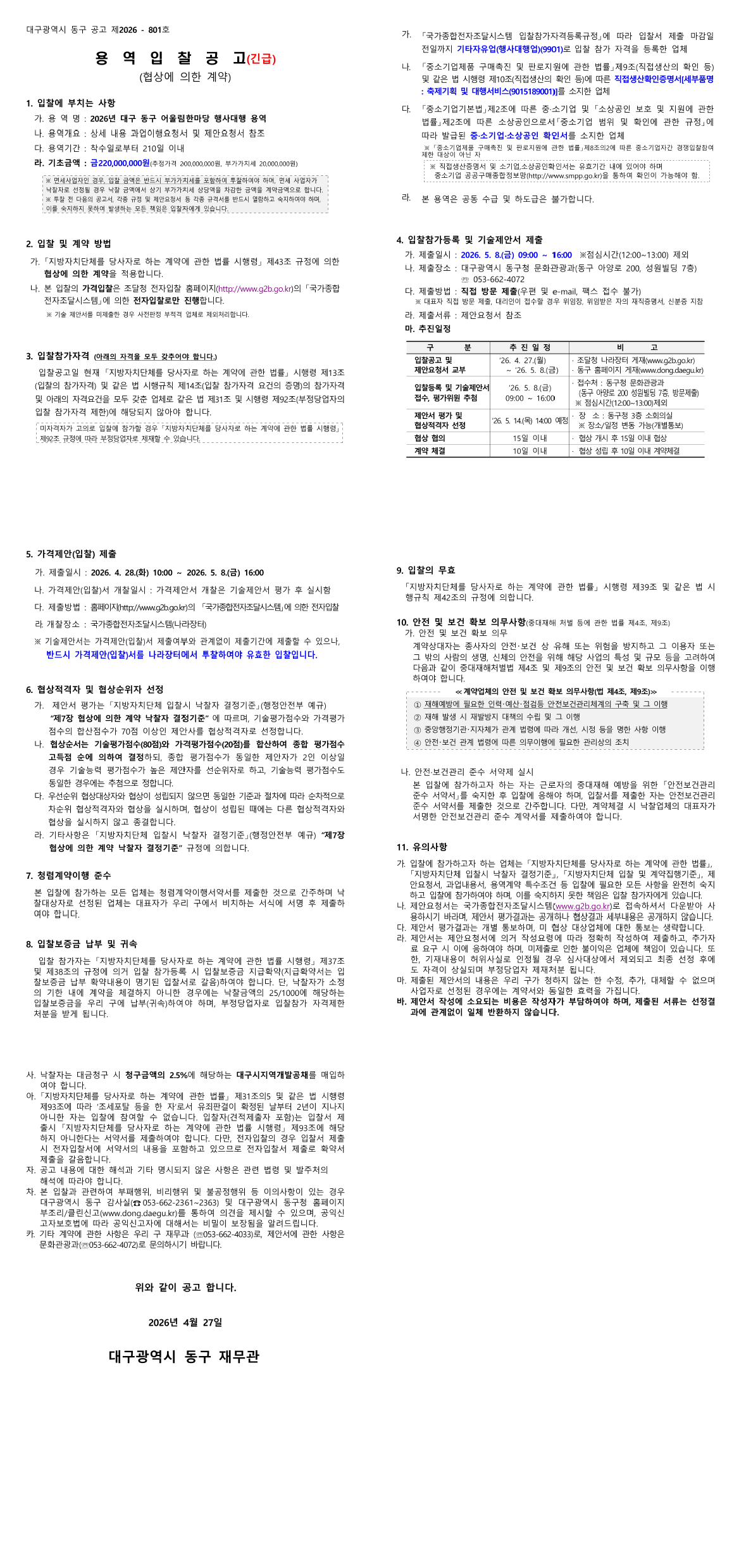 2026년 대구 동구 어울림한마당 행사대행 용역 |
