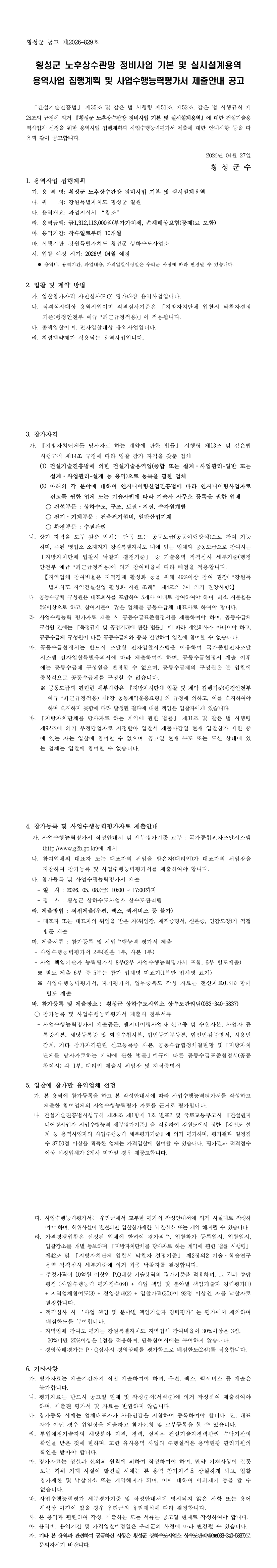 횡성군 노후상수관망 정비사업 기본 및 실시설계용역 집행계획 및 사업수행능력평가서 제출안내 공고 |