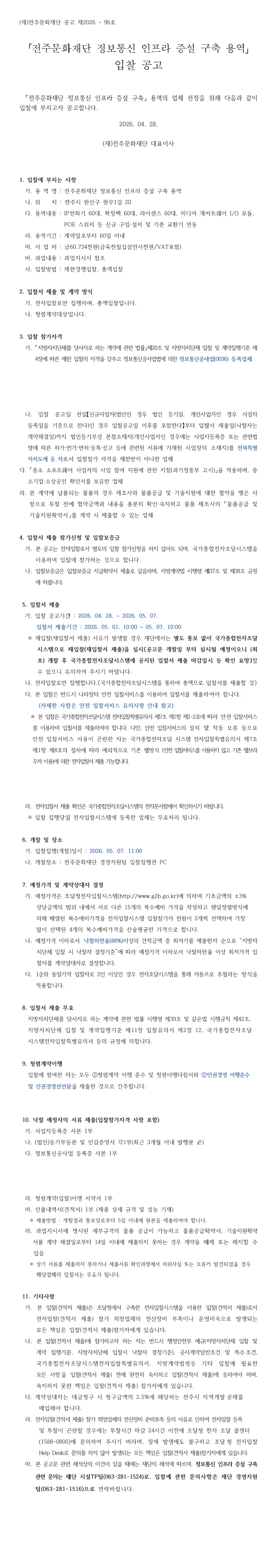 「전주문화재단 정보통신 인프라 증설 구축 용역」입찰 공고 |