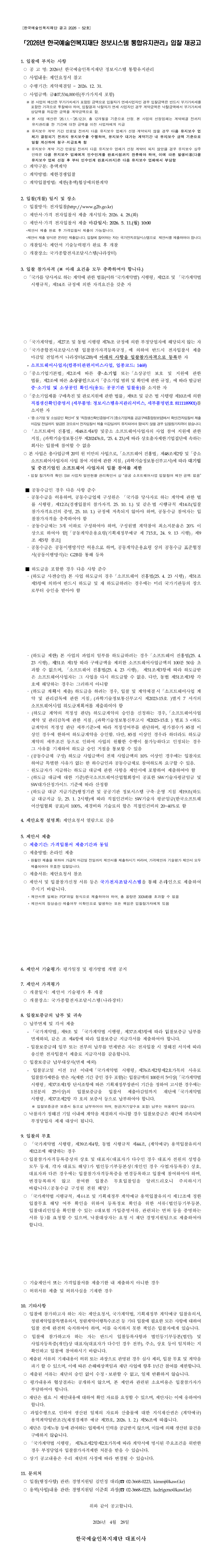 2026년 한국예술인복지재단 정보시스템 통합유지관리(재공고) |
