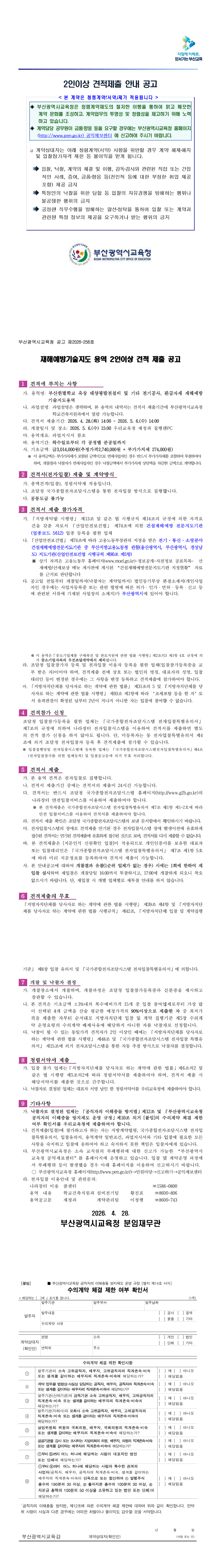 부산한별학교 옥상 태양광발전설비 및 기타 전기공사, 관급자재 재해예방 기술지도용역 견적 공고 |