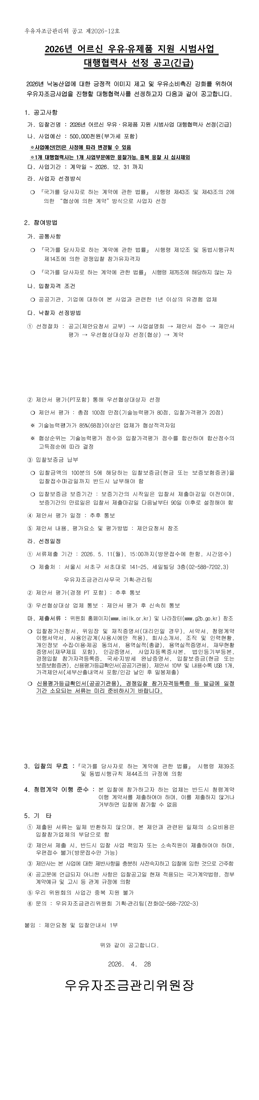 2026 어르신 우유·유제품 지원 시범사업 대행업체 선정 공고 |