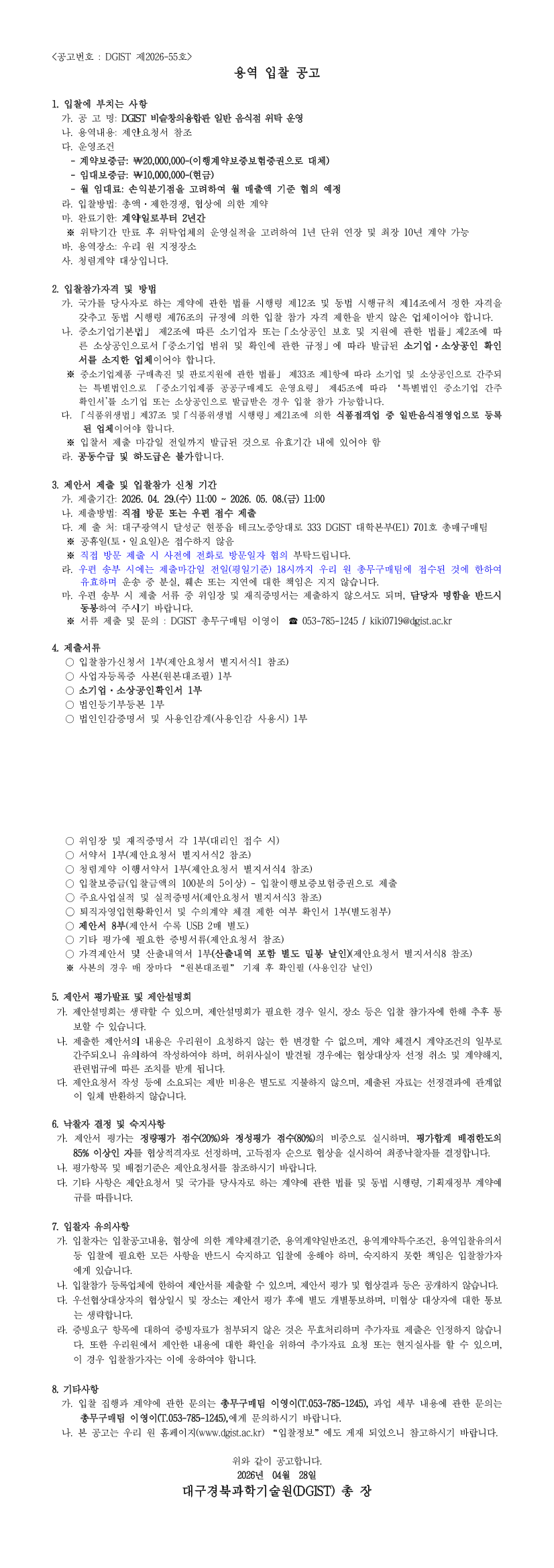DGIST 비슬창의융합관 일반 음식점 위탁 운영 |