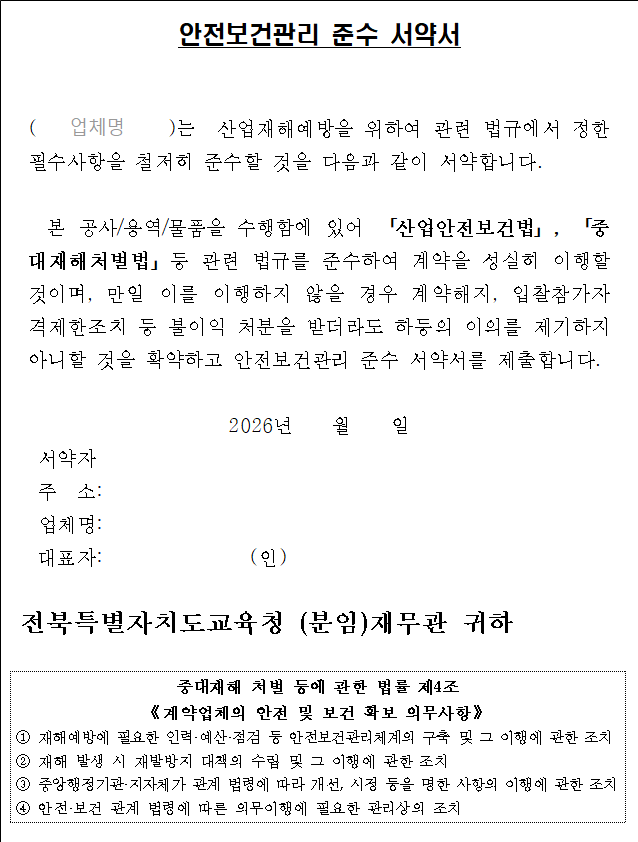 본 입찰은 지방계약법 제6조의2에 따라 청렴계약제가 적용됩니다. 입찰자는 반드시 입찰서 제출 시 아래 청렴계약(서약)제에 관한 내용을 숙지하고 승낙하여야 하며, 청렴계약(서약)제에 관한 내용을 위반한 경우 계약의 해제․해지, 입찰참가자격 제한 등 발주기관의 조치에 어떠한 이의도 제기할 수 없습니다.