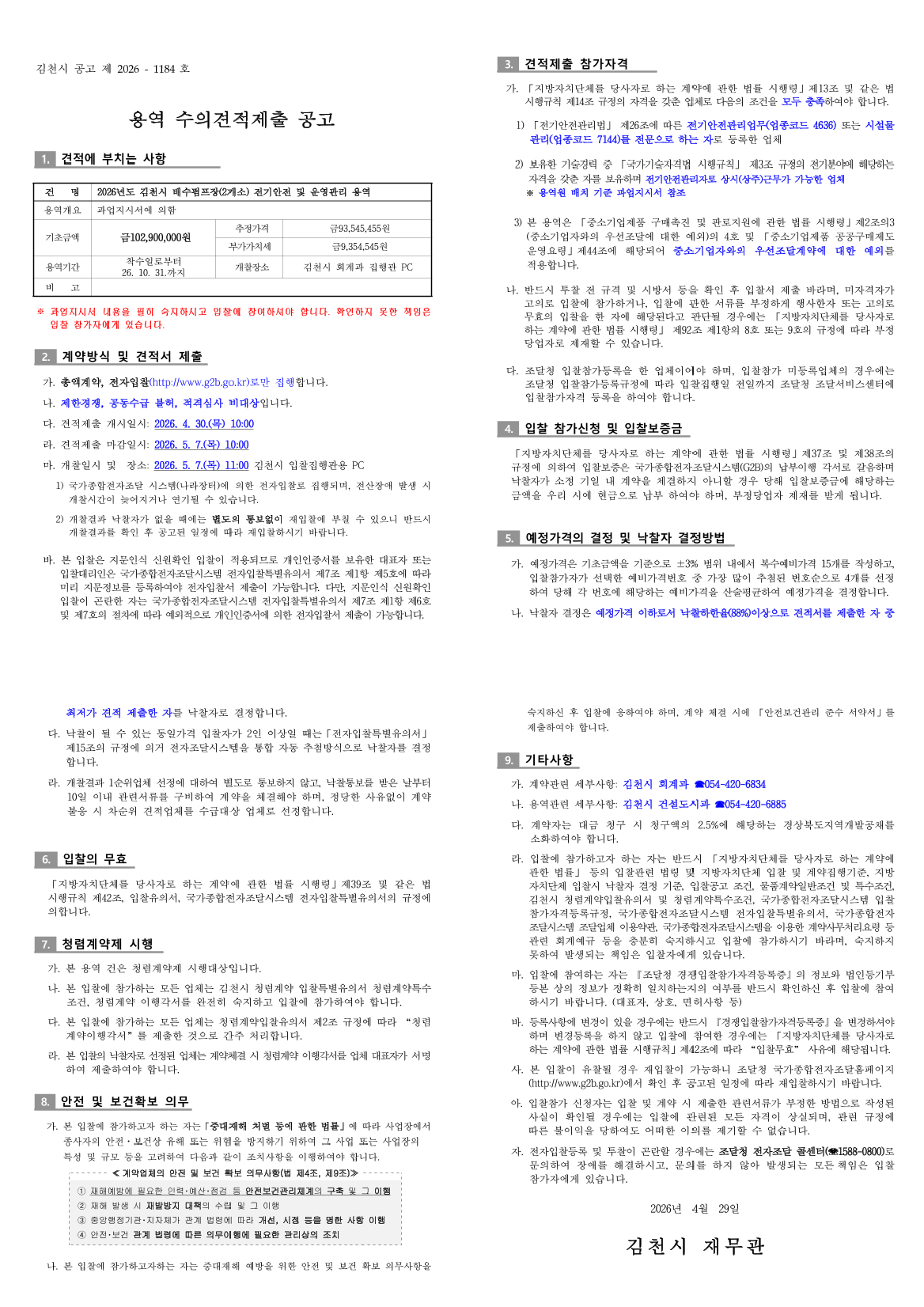 2026년도 김천시 배수펌프장(2개소) 전기안전 및 운영관리 용역 |