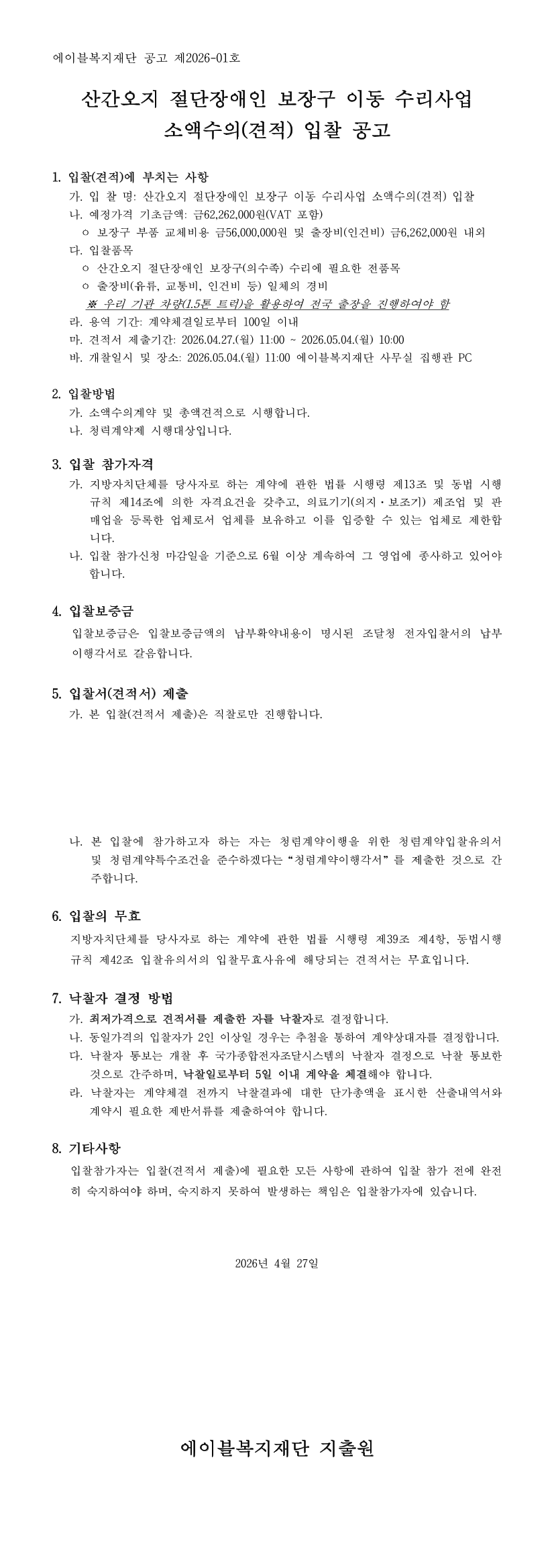 산간오지 절단장애인 보장구 이동 수리사업 소액수의(견적) 입찰 공고 |