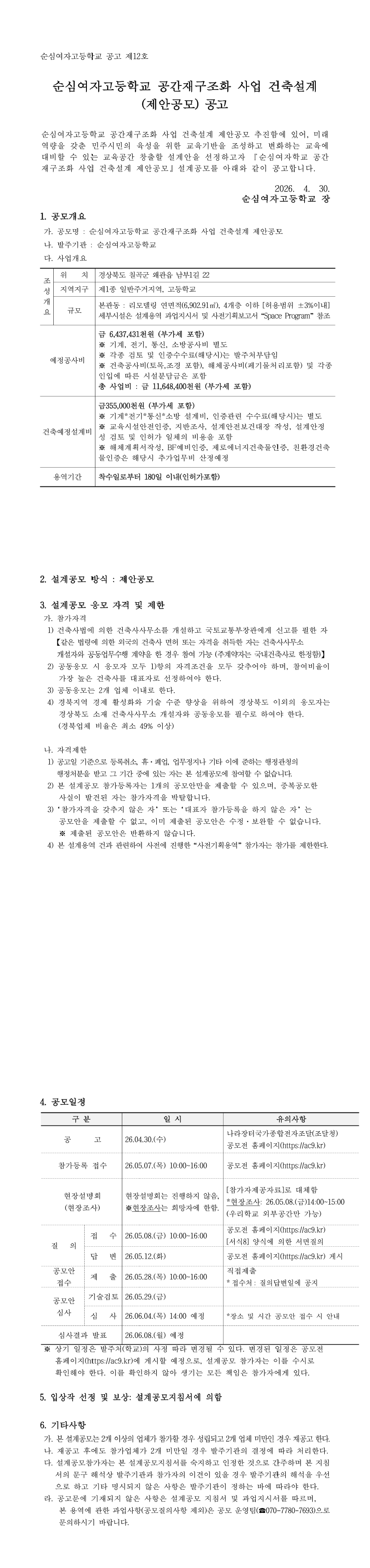 순심여자고등학교 공간재구조화 사업 건축설계(제안공모) 공고 |