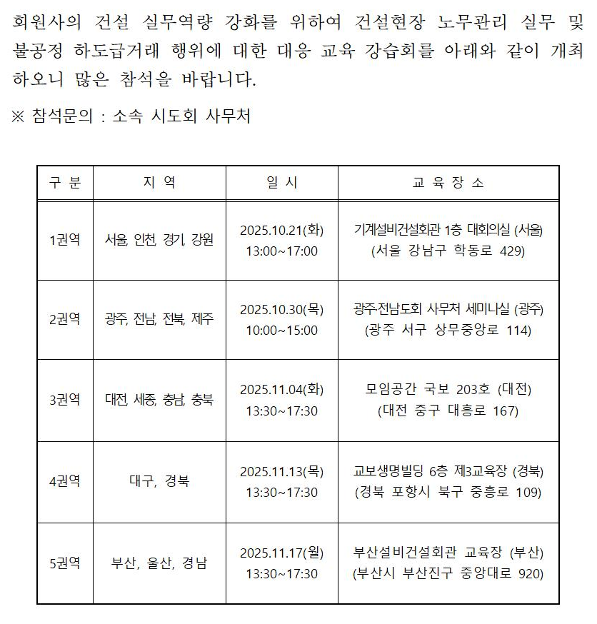 2025년 회원사 건설업 실무 교육 강습회 개최 안내