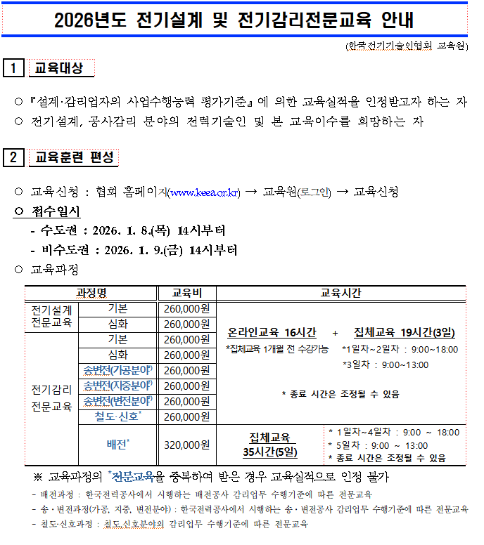 2026년도 전기설계 및 전기감리전문교육 실시 안내