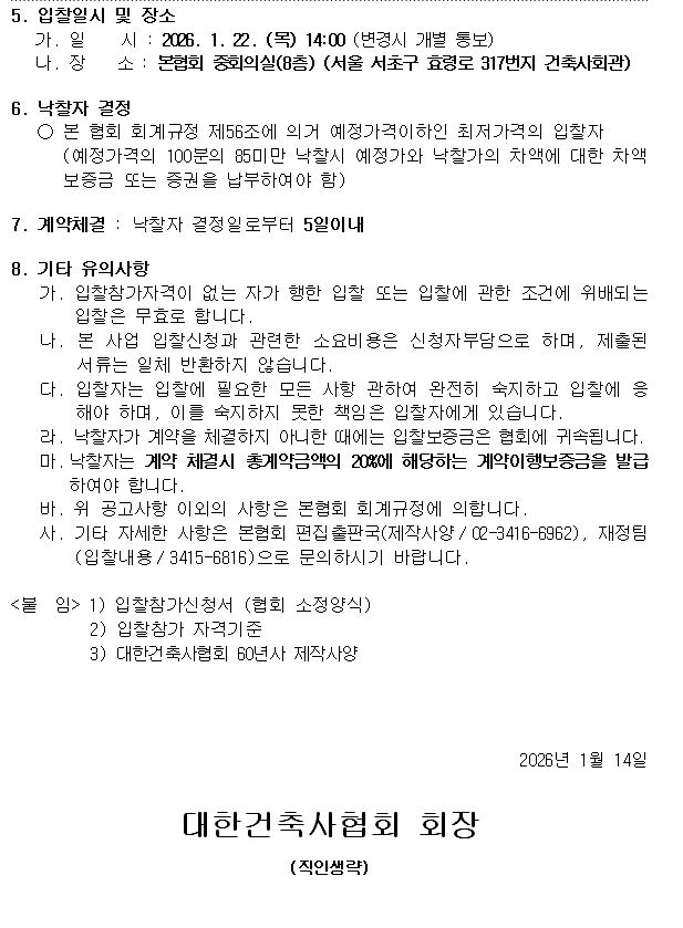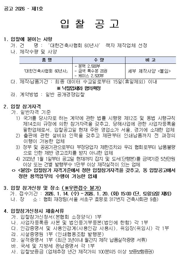 ‘대한건축사협회 60년사’ 책자 제작업체 선정 입찰공고문