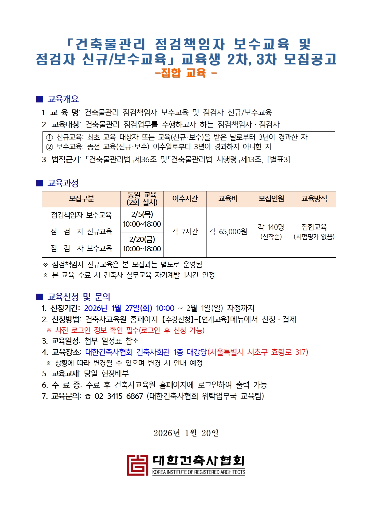 2026년 제2~3차「건축물관리 점검책임자 보수 및 점검자 신규/보수교육」교육생 모집공고