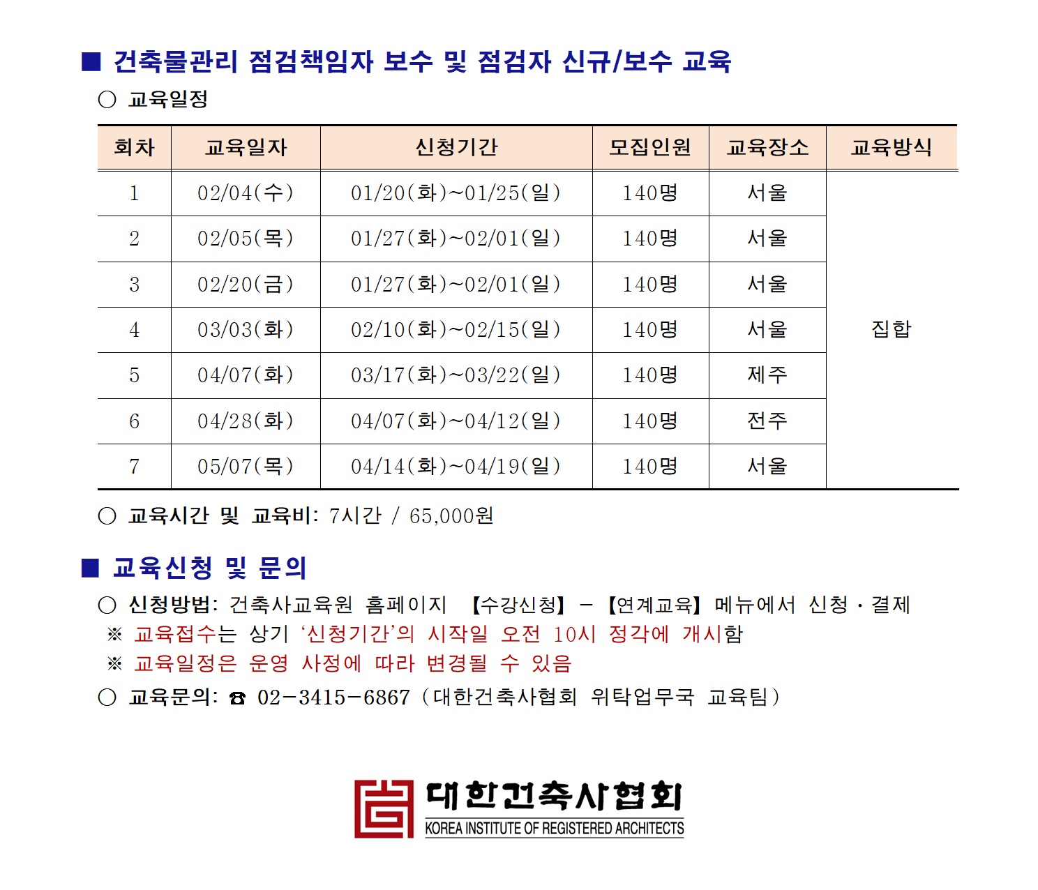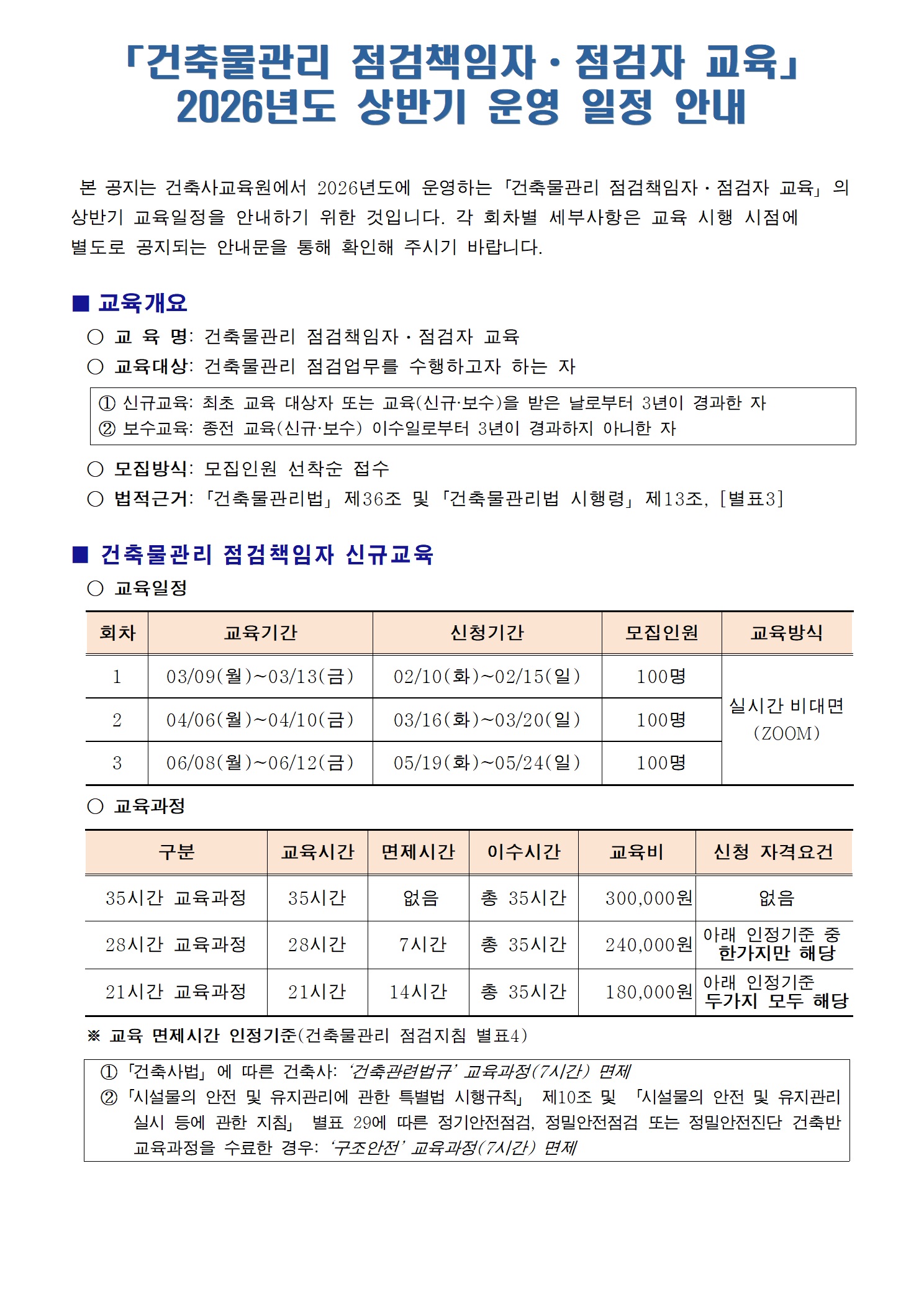 건축물관리 점검책임자ㆍ점검자 교육 2026년도 상반기 운영 일정 안내